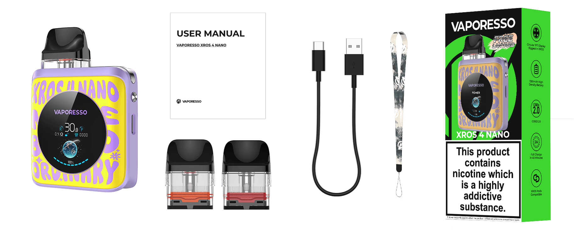 The Vaporesso Xros Nano 4 Pod System has the largest battery in the XROS Family, is the first XROS to feature a 1.3'' TFT colour screen.